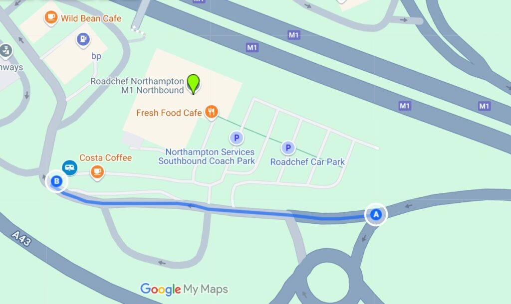 OK – There is no dedicated Caravan/Camper parking, but bays are provided that are combined with coach parking next to Costa Coffee, as shown by the caravan symbol; the route to get there is shown in blue, below.